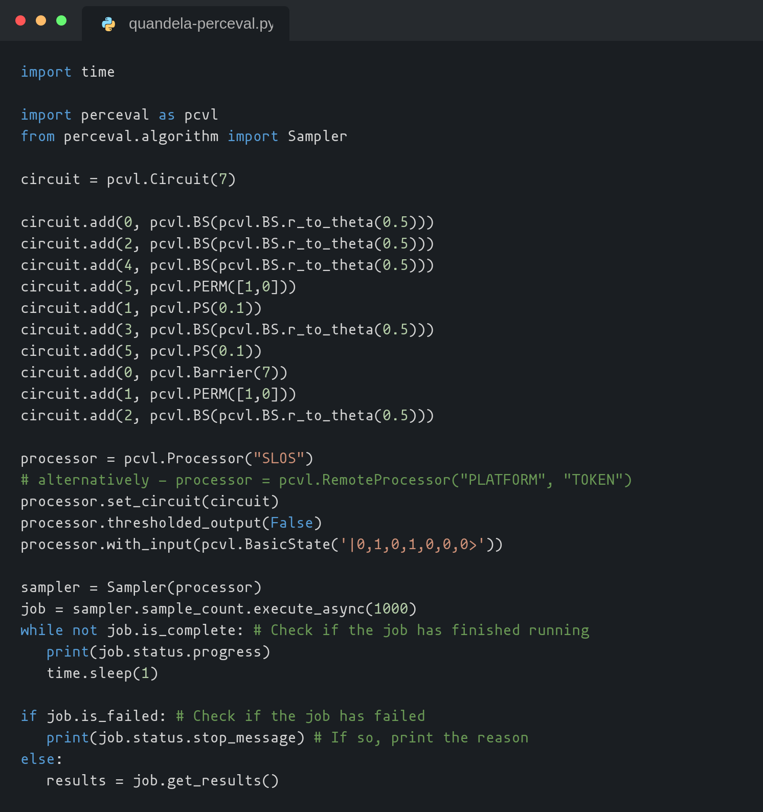 While the Composer offers an intuitive graphical interface, it also bridges the gap to real-world quantum programming. As you design your circuits, you'll notice that the Composer displays the equivalent Perceval code - our Python framework for designing and simulating photonic quantum circuits.